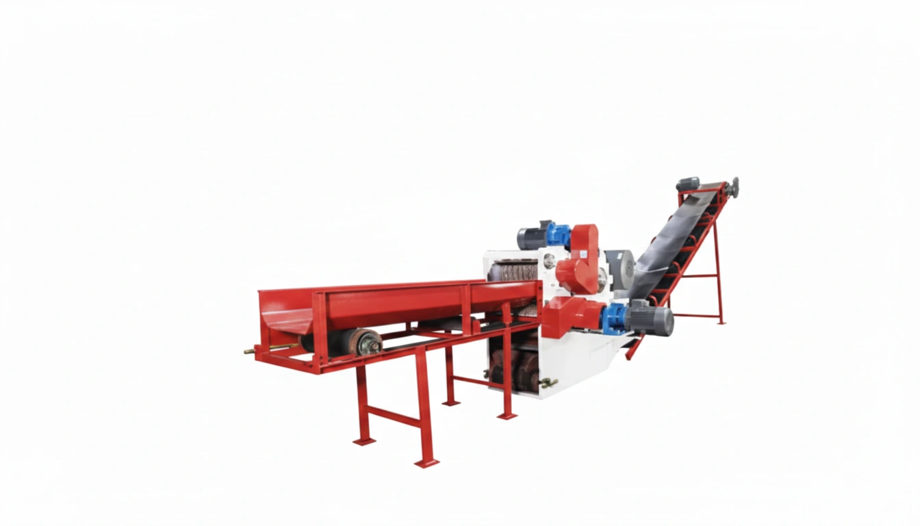 This modular chipper features an integrated infeed trough and discharge conveyor for high-capacity biomass processing. It is designed for seamless integration into automated pellet production lines.